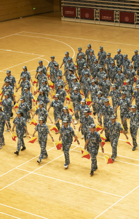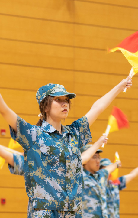 在表演项目中,有这样一只特别的队伍——旗语队。与其他的特训队相比,他们看似柔弱,却在军队中发挥着交流沟通的重要作用。他们手执红黄二色的旗帜,上举下摆间,绷直的手臂与鲜艳的旗帜共同勾勒出青春的风采。