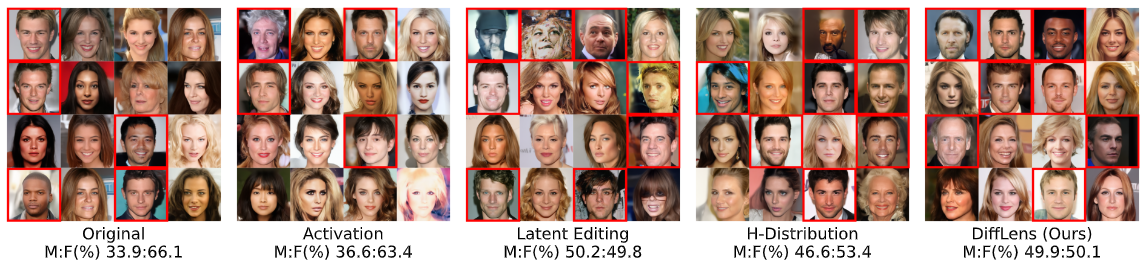 生成扩散模型在多样化内容合成领域展现了卓越的能力,但其保留训练数据偏见的输出往往会加剧社会的刻板印象与不平等。当前去除偏见的研究多聚焦于生成过程的引导策略,却忽视了模型内部驱动偏见内容输出的因果机制。本研究通过剖析扩散模型的内在决策机理,创新性地提出基于特征干预的模型编辑技术,实现偏见生成要素的精准定位与动态调控,达到社会偏见的高效纠偏。在保持生成图像质量的同时,对生成分布(社会属性的分布,如男性与女性的比例)实现有效调控。模型中存在控制生成细粒度特性的差异化内在特征,为生成模型的机制可解释性研究提供了全新的视角与方法。