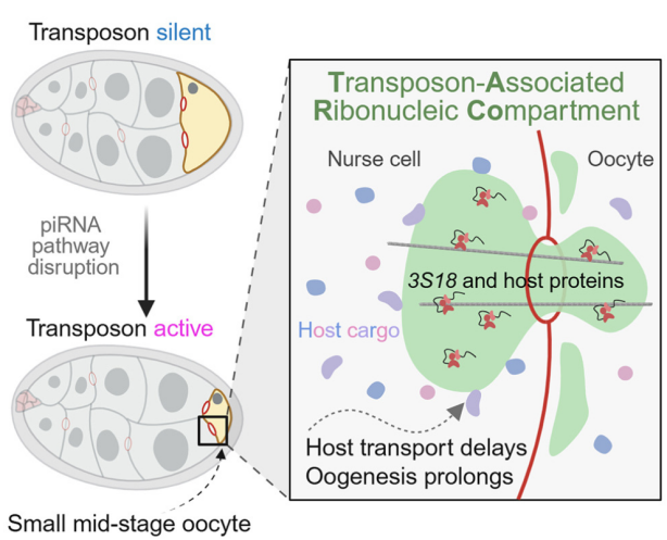 研究人员发现,转座子的激活会导致果蝇卵子发育中期卵母细胞显著变小,以及卵子发生过程延长,其中一种特定的长末端重复序列(Long Terminal Repeat)逆转座子3S18是造成这种表型的主要因素。在果蝇中期卵室中,3S18 mRNA及其整合酶在胞质桥附近形成了微米级的RNP聚集体,研究人员将其命名为TARCO(Transposon-Associated Ribonucleic Compartments)。有趣的是,当破坏这些RNP聚集体的形成,3S18 mRNA的水平显著降低,这表明TARCO对保护逆转座子产物有重要功能。