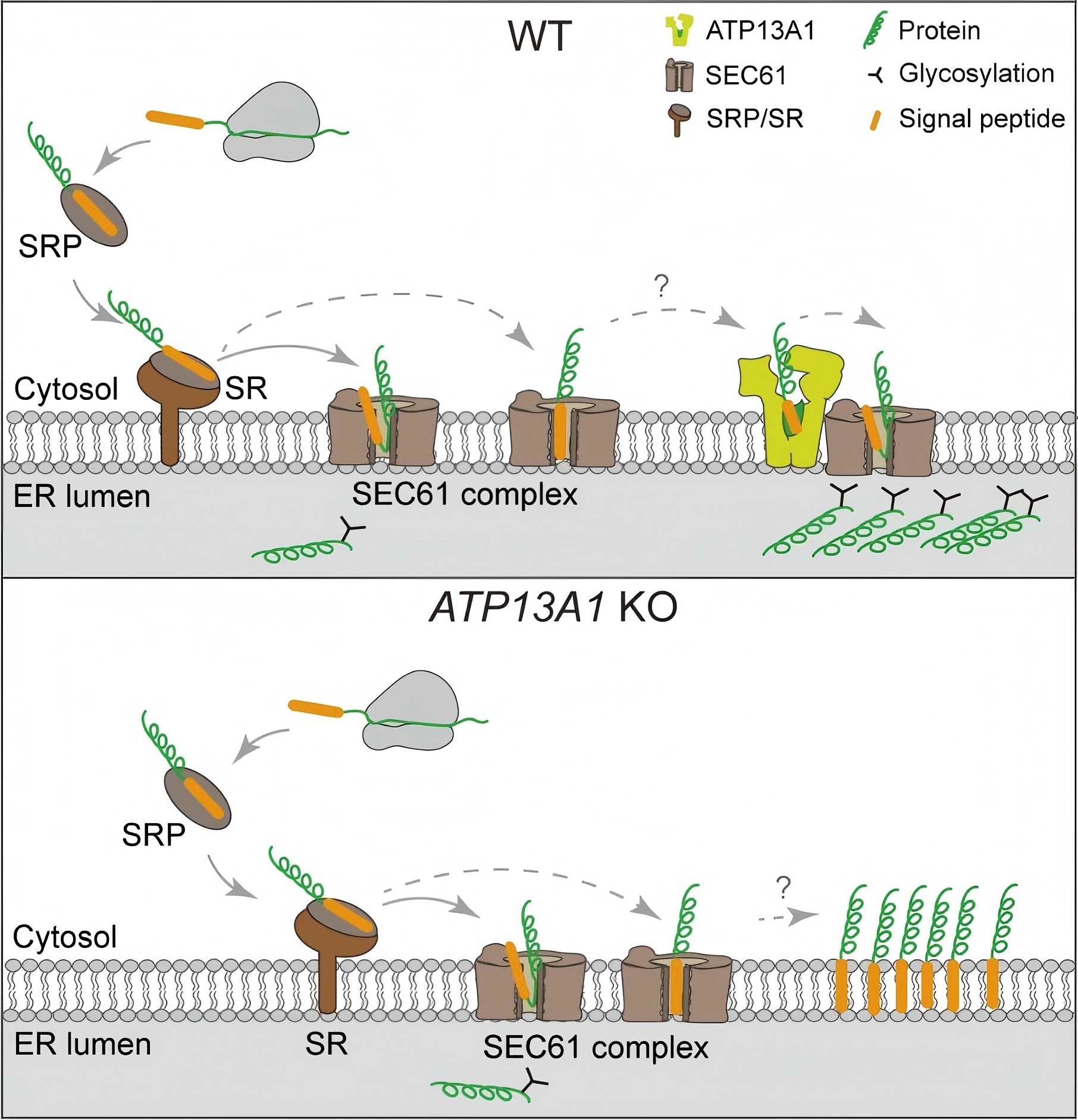 在进化层面上,真核生物中靶向内质网的信号肽相较于原核生物中靶向质膜的信号肽,其N端带正电荷的氨基酸通常较少。这一特征可能有助于避免与细菌来源的线粒体靶向序列发生交叉干扰。真核生物中出现的P5A ATP酶(ATP13A1),通过协调蛋白质质量控制系统和转运机制,为这类易出错的信号肽提供了解决方案。由此,本研究揭示了一条对非典型(易出错)信号肽至关重要的转位调控机制,为理解蛋白质分泌系统如何高效、高保真地应对多样性底物提供了重要见解。