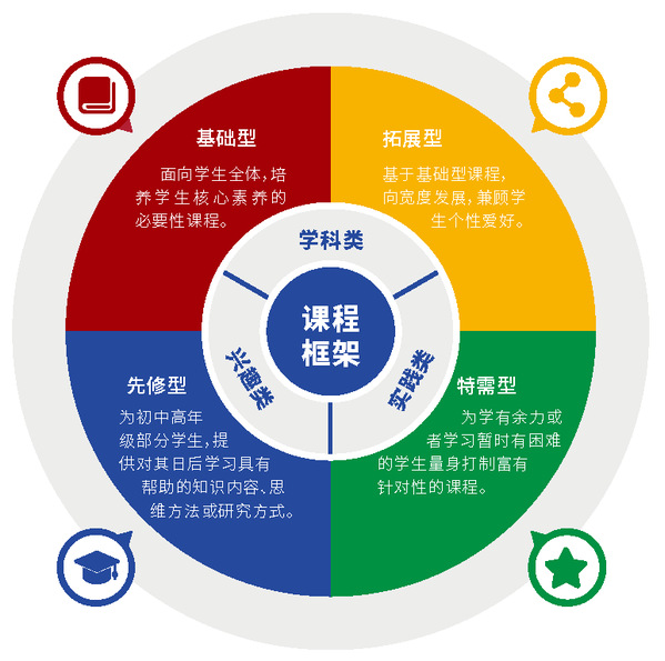 根据学校发展愿景、学生身心发展规律及其认知差异,关注学生成长的三个不同阶段,构建富有弹性的“三类”、“四型”的课程框架。